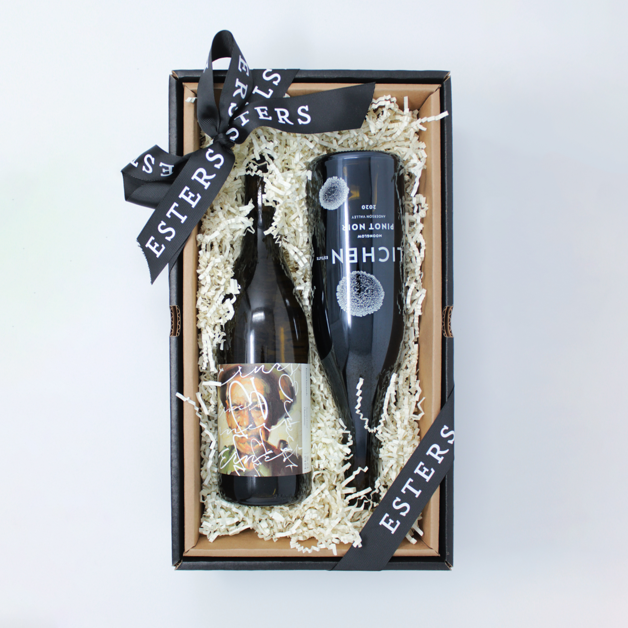 Give the California wine lovers what they want: Chardonnay and Pinot Noir. These are Esters-approved small producers who make seriously elegant and delicious versions of two classic varietals. Both bottles are wrapped up in a black/kraft box with crinkle paper and Esters’ ribbon.