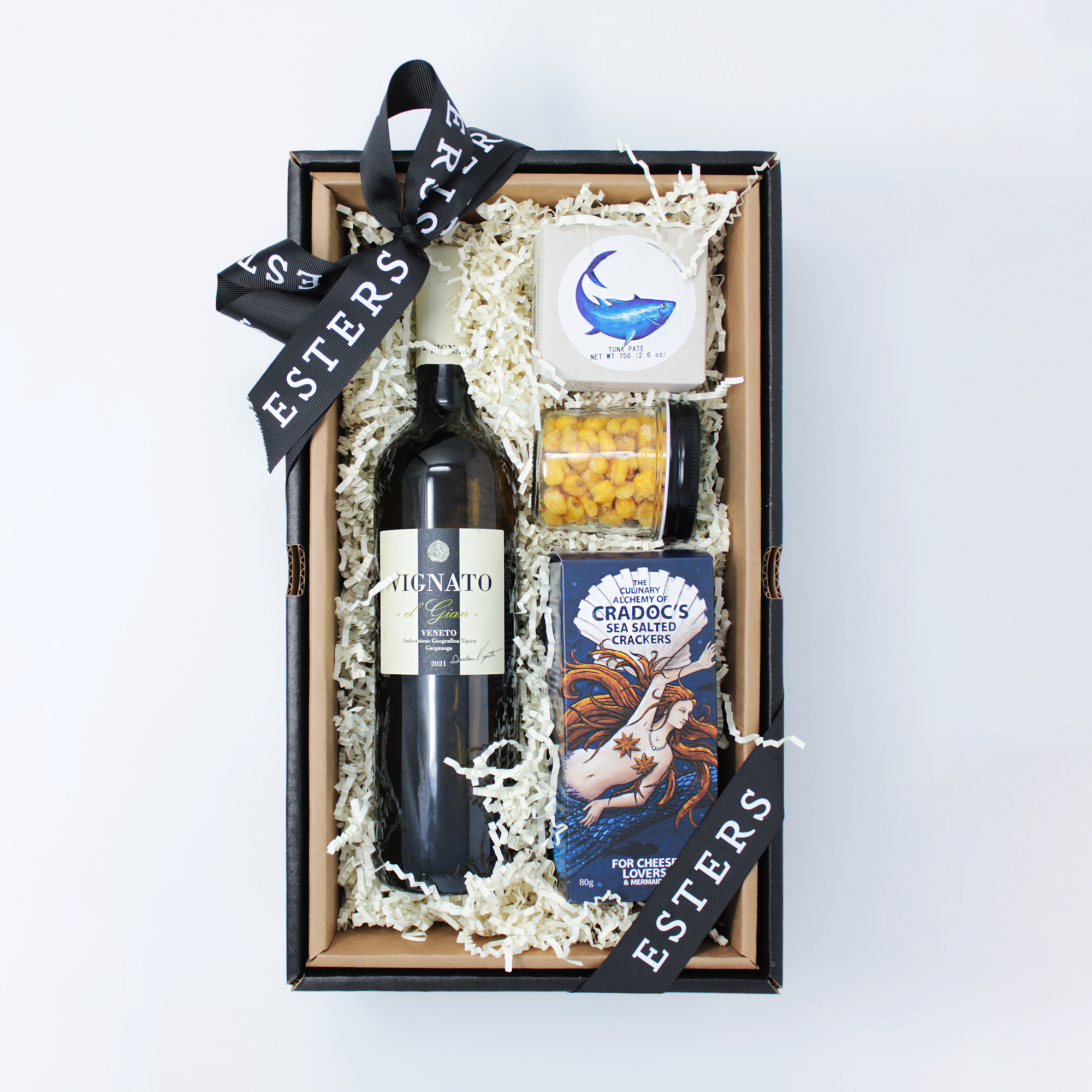 The tinned fish is all the rage and we’re here for it! This is the perfect gift for the gourmand in your life, who isn’t afraid of a fine tuna paté. A bottle of wine and these salty goodies are wrapped up in a black/kraft box, with crinkle paper and Esters’ ribbon.
