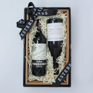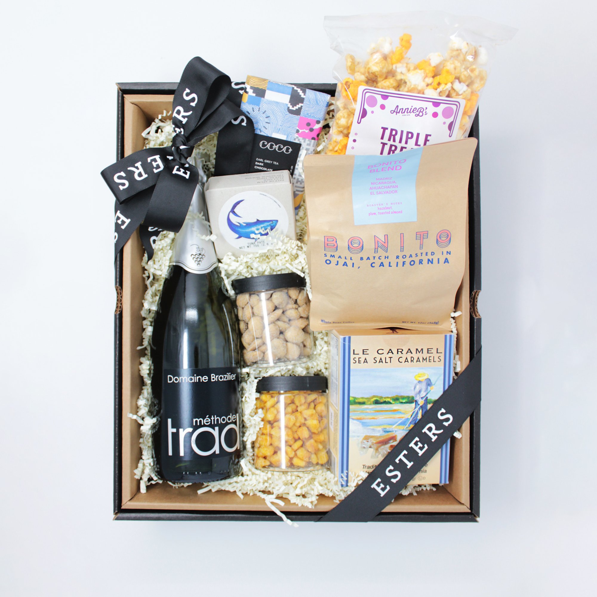 From your morning buzz to late night snacks, this box includes all of Kathryn’s favorite goodies in our shop. Plus wine, of course! And it’s all wrapped up in a black/kraft box, with crinkle paper and Esters’ ribbon.