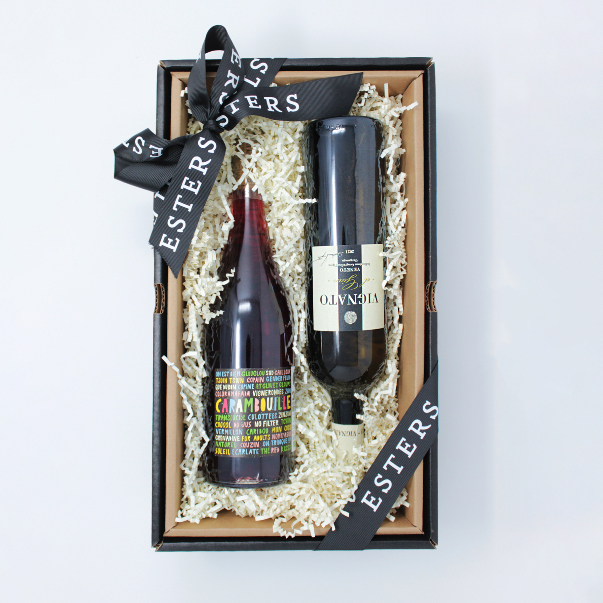 Just fresh, fun wine. This box includes two wines we’re drinking all the time over here at Esters – natural, fancy-free and DELICIOUS! Both bottles are wrapped up in a black/kraft box with crinkle paper and Esters’ ribbon.